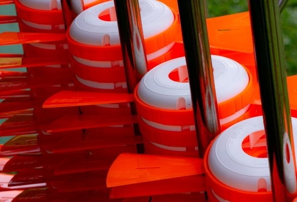 A hélice — formada por duas partes, o copo branco e as pás laranjas — é lançada por máquinas automáticas, que garantem variação e realismo a cada disparo.